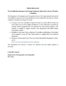 Consular, Mission Press Releases, Press Release, VISA Visa Facilitation Measures for Foreign Nationals Affected by Adverse Weather Conditions Post by SLDHC Chennai Last Updated on Nov 29, 2025 https://eservices.immigration.gov.lk/vs/login.php