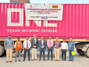 The Deputy High Commission of Sri Lanka for Southern India has successfully dispatched three containers (comprising two 40-foot containers and one 20-foot container) of flood relief items from Chennai Port to Sri Lanka, comprising generous donations received from well-wishers and Sri Lankans residing in Southern India towards the Sri Lanka Flood Relief Fund, in support of the people of Sri Lanka affected by Cyclone Ditwah.  The relief materials include essential items such as dhal, sugar, milk powder, clothing, and other life-support supplies, intended to address the immediate humanitarian needs of the affected communities.